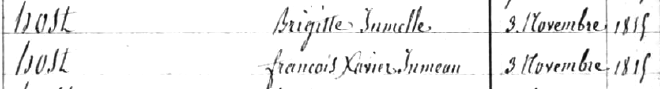 L’acte de naissance est digne d’interết pour la liberté d’écriture de l’officier d’état civil. Xavier s’appelle François Xavier mais son premier prénom est très peu usité dans les autres documents que j’ai pu trouver.