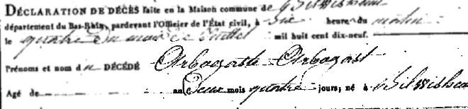 Il est vrai que j’aurai pu faire le calcul moi même mais pour une fois, l’information était fournie. On pourrait se dire, aussi, qu’il ne s’agit pas du même enfant, mais des Arbogaste Arbogast né à Bilwisheim en 1819, je vous laisse chercher, mais il n’y en a pas légion ! L’âge où il est décédé réellement est donc : 3 mois et 3 jours.