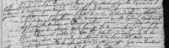 Le treizième jour de juin 1730 [...] moi pretre soussigné avec permission de Mr le curé, la bénédiction nuptiale après les publications faites canoniquement en cette eglise, René avril [...] meunier et Marie Pineau [...], en présence de jacque avril frère du marié de la paroisse de la pommeraye, jacque et rené les avril oncles du marié, [???] pineau père de la mariée, louis oger oncle par alliance de la mariée, louis oger cousin germain de la mariée tous de cette paroisse qui ont déclaré ne savoir signer.