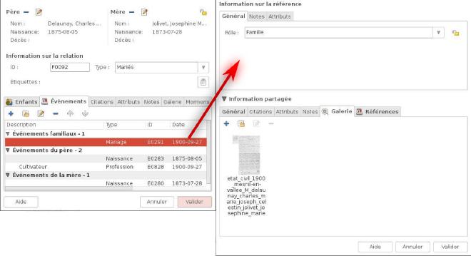 La relation entre l’acte et l’événement “mariage”. Le lien est créé dans l’onglet “galerie”