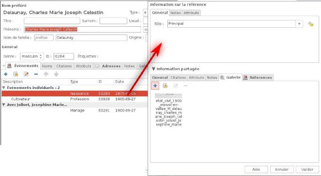 Dans Gramps, j’attache le fichier pdf à la galerie de famille et les images seront liées aux informations qu’elles mentionnent comme je procède pour les actes (voir ci-dessous).
