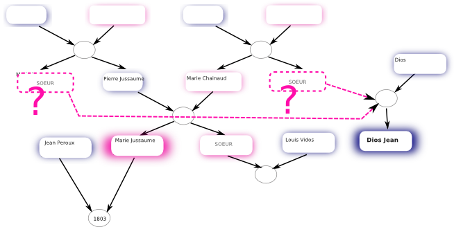 En revanche, pour le deuxième témoin “Jean Dios […] cousin germain de la future”, j’ai un problème : Je sais que le père ou la mère de la mariée a une soeur et que celle-ci est la mère de ce Jean Dios.